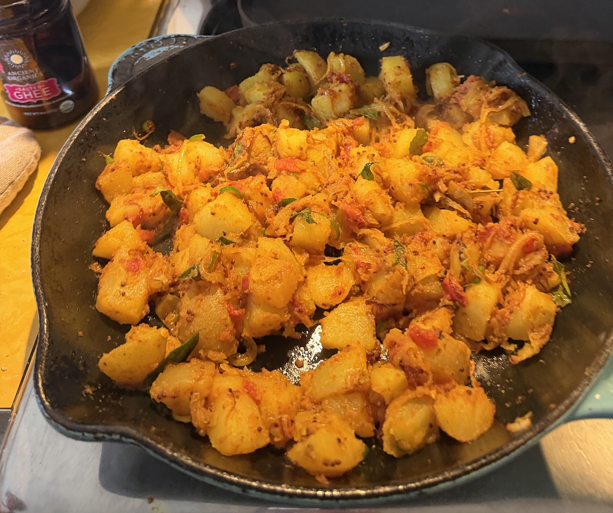 Inspired by potatoes we’d had in both India and Sri Lanka, these were delicious and easy to make, spiced with turmeric, cumin, coriander, fresh curry leaf, and garam masala. Generally, the idea is to parboil potatoes, cube them, then fry then with onions and spices, cooking until the water evaporates: