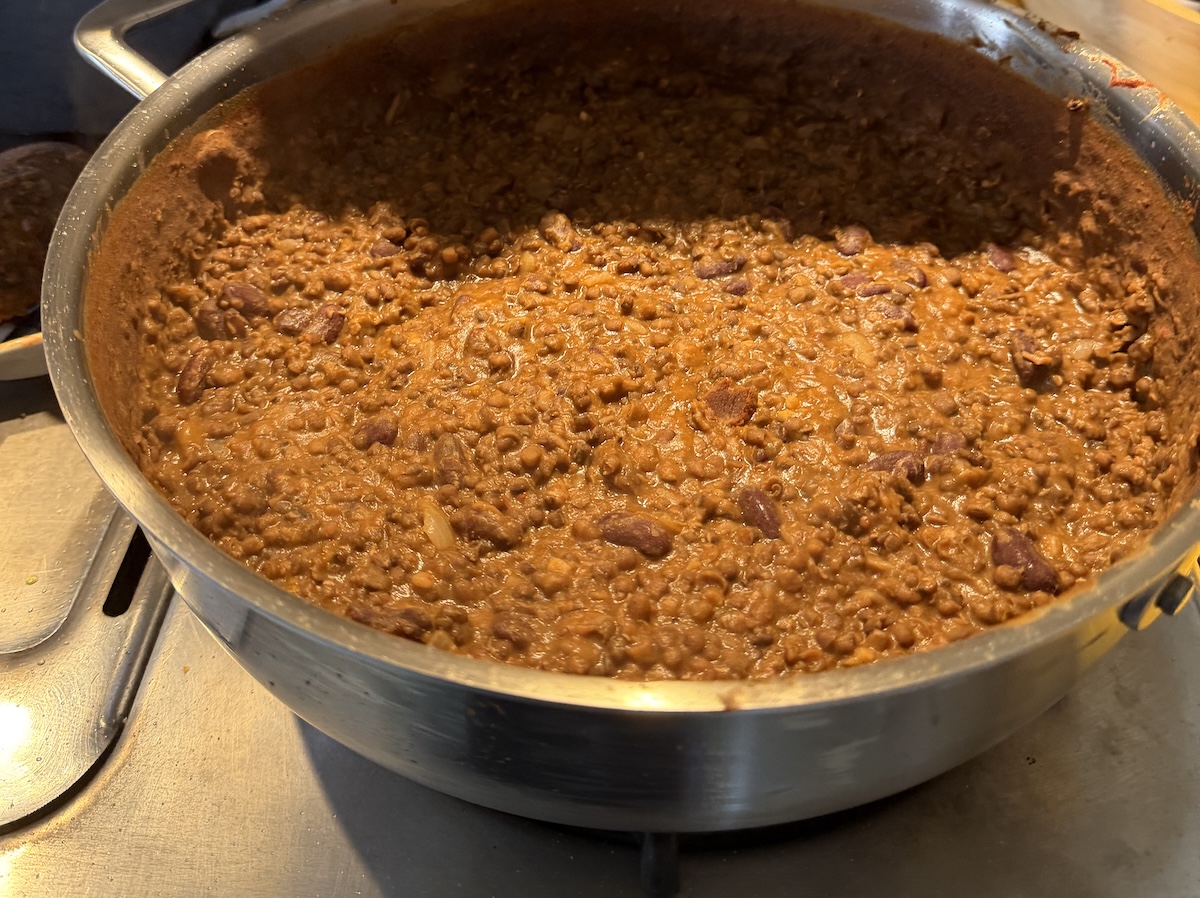 Add the softened dal, its cooking juices, a can of kidney beans (if dry beans weren’t added to the dal), and about a cup of water.